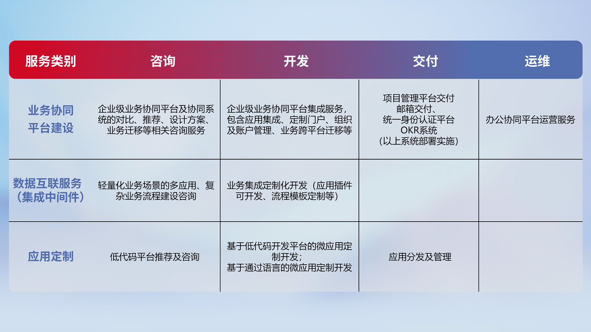 针对钉钉、、、企微、、、、IDaas等平台级产品提供产品的规划、、方案、、、、交付、、、、定制化开发等服务,,实现如统一协同办公、、、、智能客户服务、、混合会议管理、、、智能数据查询、、等业务场景,,,实现数字化转型。。。